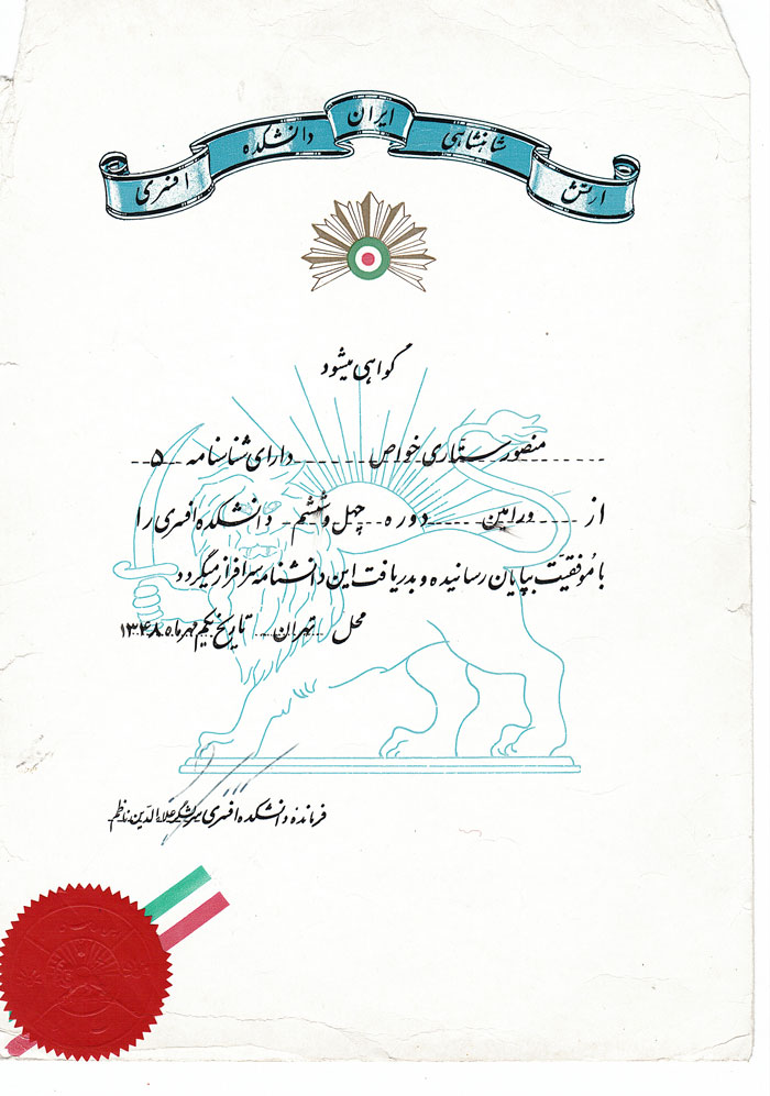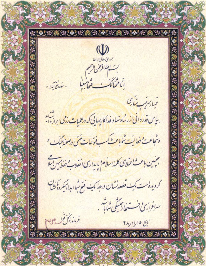 به پاس قدردانی از رشادت‌ها و فداکاری‌هایی که در عملیات رزمی برداشته‌اید و شجاعت و فعالیت شما باعث کسب فتوحات مهمی در صحنه جنگ و همچنین باعث اعتلای کلمه اسلام و پایداری و انقلاب و حفظ میهن اسلامی گردیده است، یک قطعه نشان درجه یک فتح به شما اهدا می‌گردد تا نشان سرافرازی و افتخار همیشگی شما باشد.