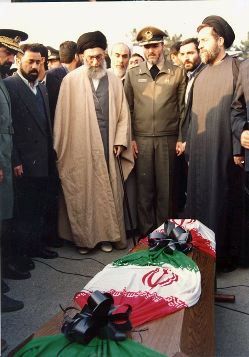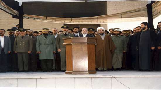 حجت الاسلام والمسلین شهیدی محلاتی نماینده ولی فقیه در ارتش (راست)، آیت الله محمدی گلپایگانی رییس دفتر مقام معظم رهبری، سرلشگر شهبازی فرمانده ارتش و سرلشگر محسن رضایی فرمانده سپاه پاسداران؛ در مراسم تشییع پیکر شهید منصور ستاری؛ رهبر فرزانه انقلاب را همراهی می کنند.
